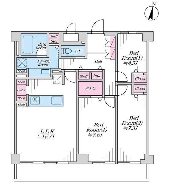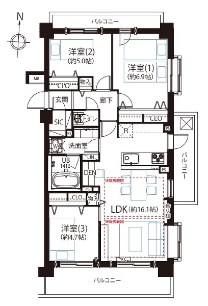 - LDK16.1帖の3LDK角住戸。南・東・北にバルコニーがあり採光・通風◎。新規...