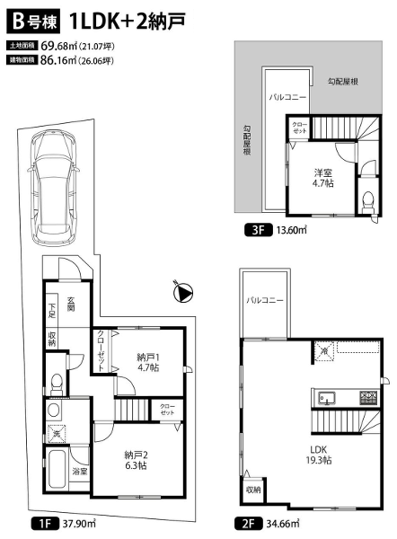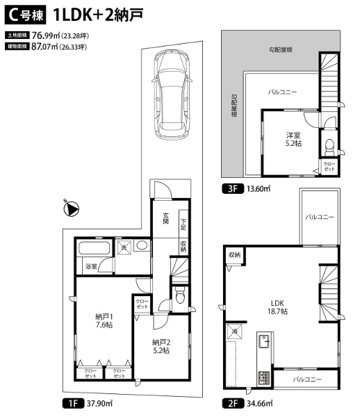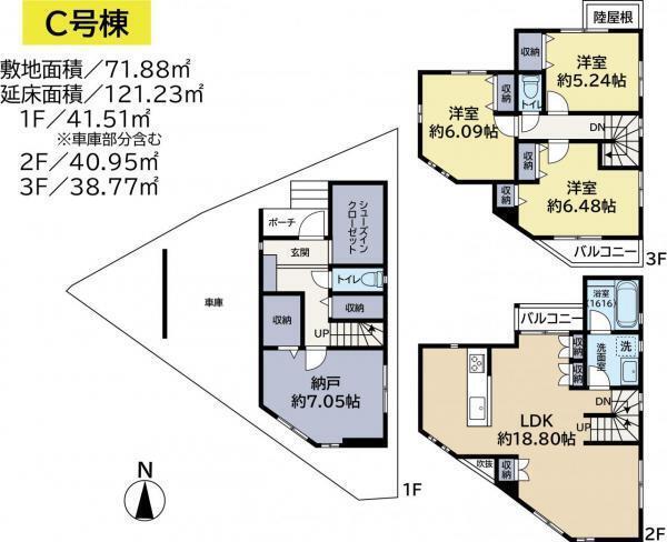 - 3階部分に南向きワイドバルコニー(水栓付き)。収納箇所豊富で...