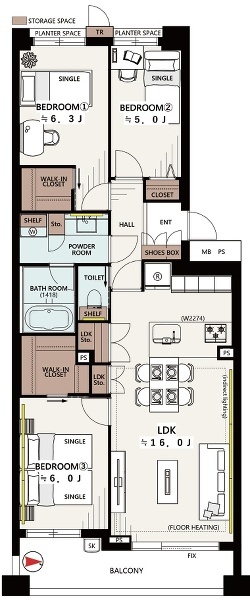 - ◆ 専有59.33m2の3LDK、南向きにつき採光に配慮された住戸◆ 全居室フロ...
