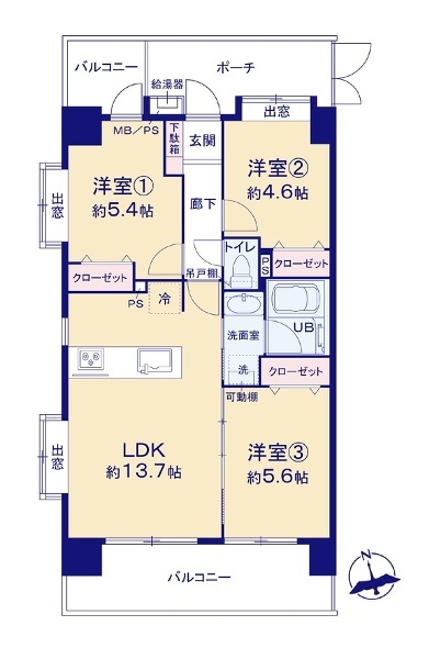 - 南西角部屋、採光と通風に配慮された3LDK住戸。LDK約13.7帖と居室3部屋を...