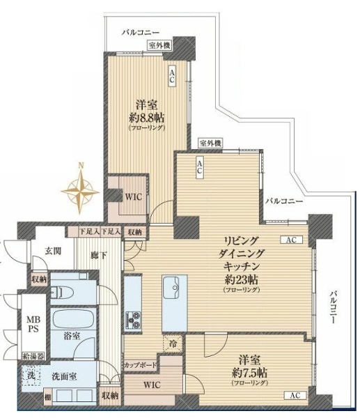 - 地上26階建の25階部分に位置する、2LDK角住戸。LDK約23帖、主寝室約8....