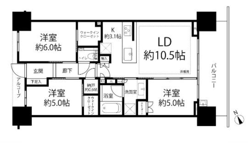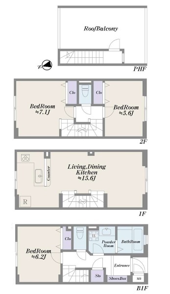 - 専有面積90.07m2の3LDK、戸建感覚のタウンハウス。LDK15.6帖、各居...