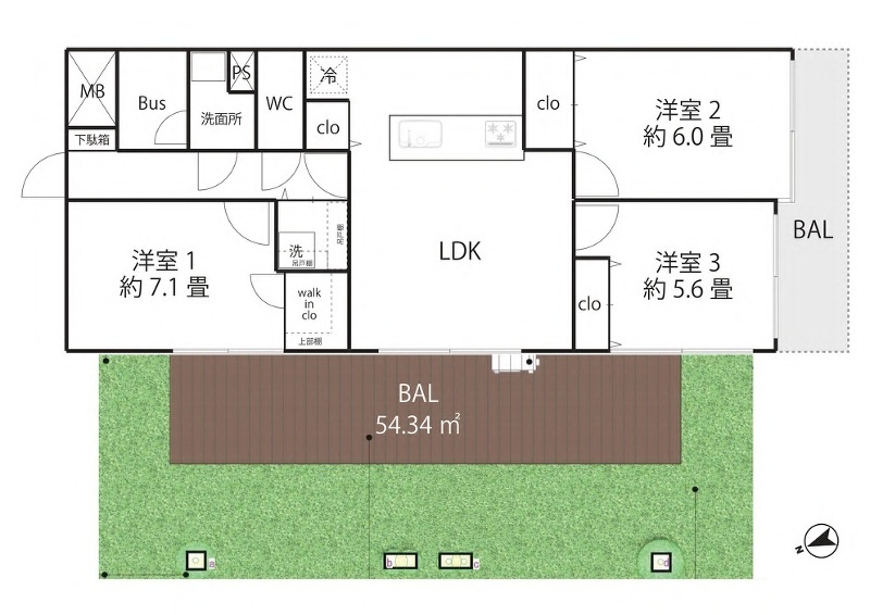 | バルコニー面積 | 54.34m²/西側 | ルーフバルコニー面積 | |