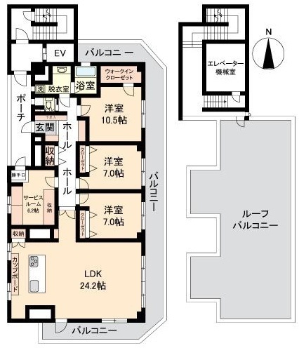 | バルコニー面積 | 36.8m²/東側 | ルーフバルコニー面積 | 63.25m² (使用料:3160円/月) |